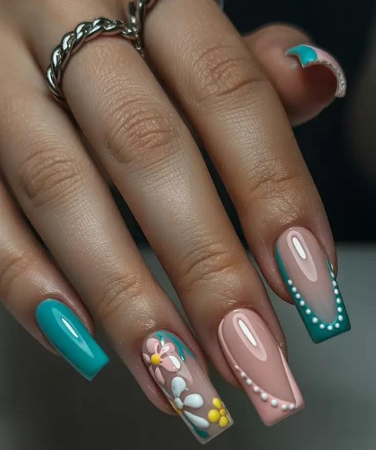 This design mixes glossy nude pink and teal shades with modern French tips and dotted accents for a stylish look. A soft floral accent nail adds a cute spring touch, making the overall design feel playful and elegant May vibe.