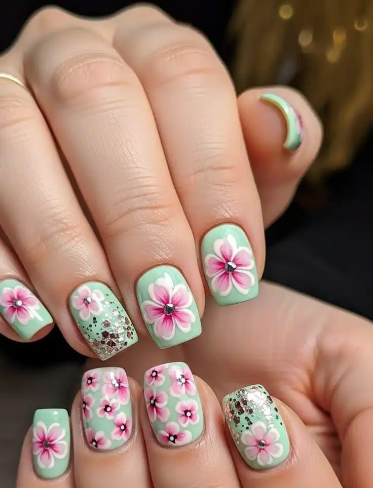 This design features mint green nails with pink floral accents and a few glittery statement nails for extra sparkle. The mix of flowers and shimmer creates a playful, lively manicure perfect for May.Â