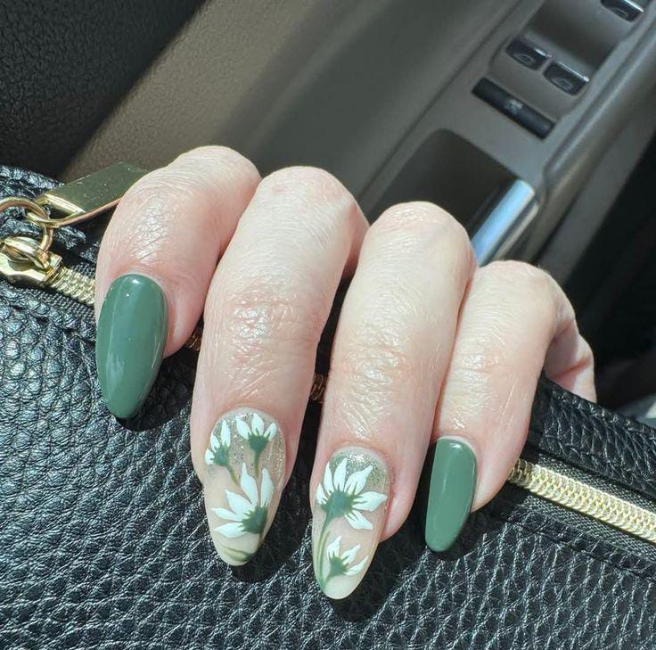 This design mixes solid sage green nails with accent nails featuring white daisy flowers on a nude base. The muted green tones and shimmer give it a calm, earthy, and elegant May summer look.