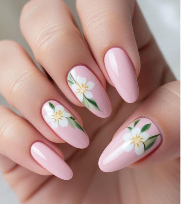 Soft blush pink nails are paired with simple white flowers and green leaves for a delicate spring look. The design feels clean, feminine, and gently May floral.