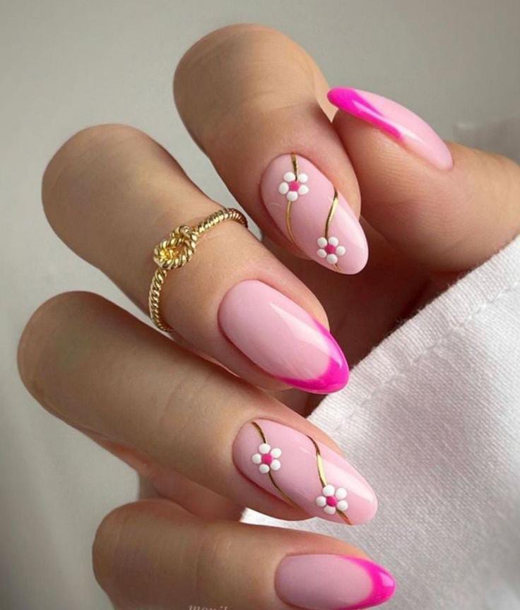 Light pink nails feature bright pink French tips with tiny white flower accents connected by thin gold lines. The design feels playful, elegant, and perfect for a cute May manicure.