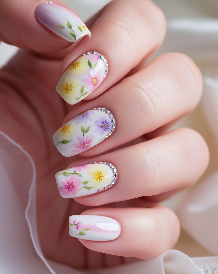 Milky white nails are decorated with delicate pastel flowers and tiny green leaves for a soft floral feel. A line of small rhinestones along the edge adds a subtle sparkle and elegant May touch.Â