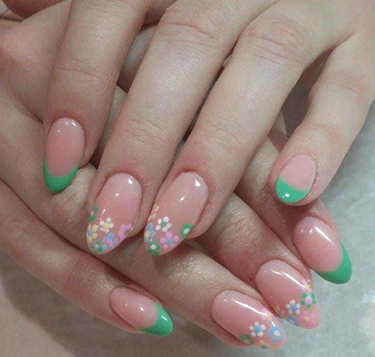 Soft nude nails are paired with fresh mint green French tips for a clean and playful summer look. Tiny pastel flowers near the tips add a cute, cheerful vibe that feels perfect for May.