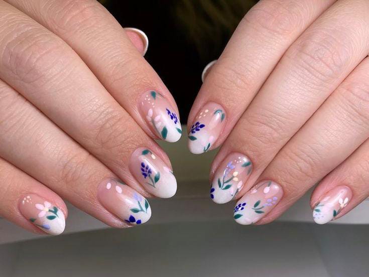 These nails feature a sheer pink base with soft white ombre tips and hand-painted floral details in purple, blue, and green leaf. The design feels light, elegant, and inspired by a blooming spring garden perfect for May. 🌸