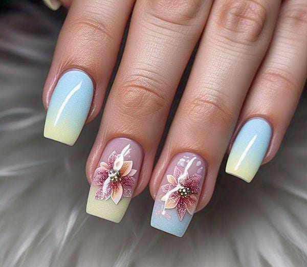 These nails feature a soft pastel gradient blending blue and yellow with delicate 3D floral style accents. The look feels dreamy, fresh, and perfect for a soft May vibe.