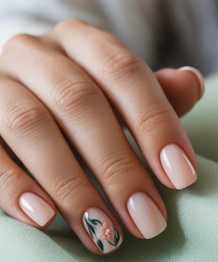 These nails feature a soft nude base with a clean, glossy finish that looks simple and elegant. A delicate green leaf design on one accent nail adds a subtle natural touch perfect for a fresh May look.