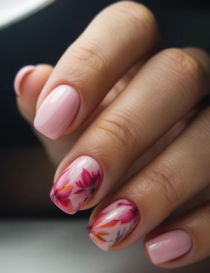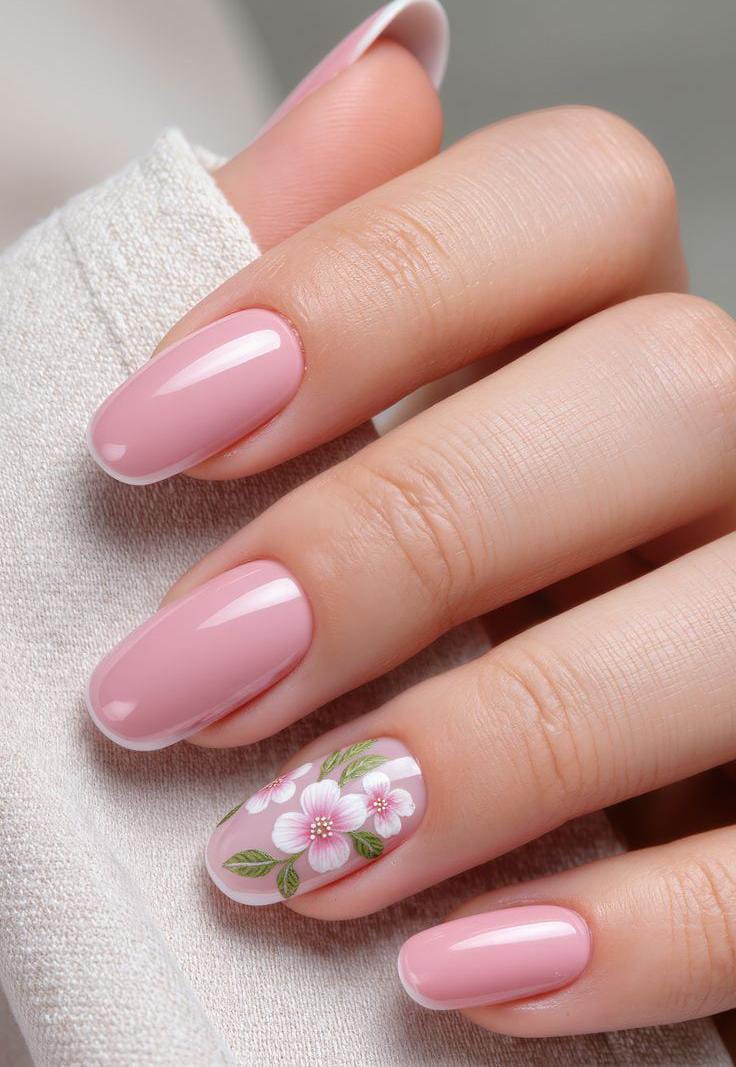 A glossy baby pink base keeps the nails clean and elegant, while a couple of accent nails feature delicate pink floral artwork. The style feels soft, romantic, and beautifully suited for May. 🌸