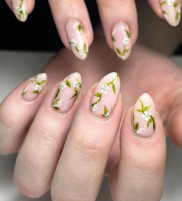 A sheer nude base is decorated with tiny white flowers, dots and thin green leafy vines across each nail. The design feels light, natural, and beautifully captures a soft spring garden vibe perfect for May. 🌸