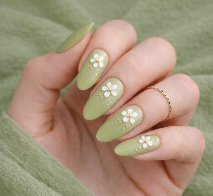 These nails feature a soft sage green base with small white daisy flowers that create a fresh, nature-inspired look. Tiny gold bead accents add a subtle touch of elegance and May charm.