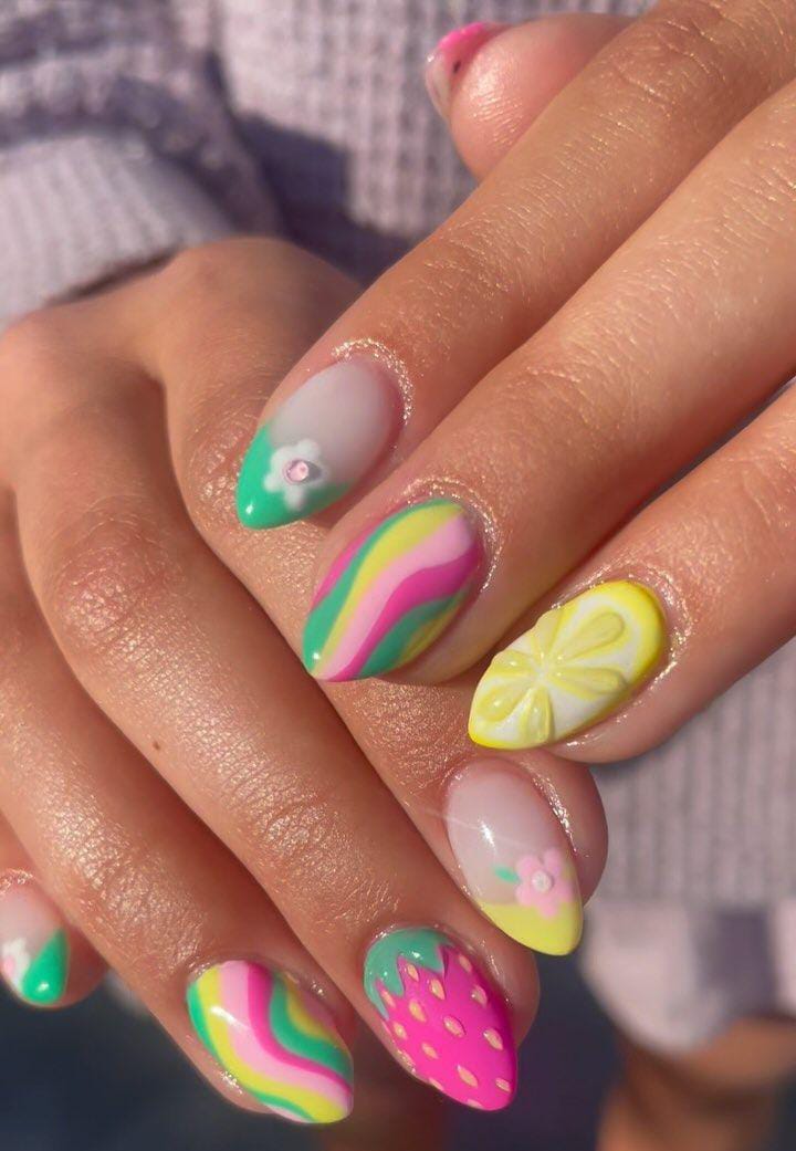 This colorful tip design mixes bright swirls, tiny flowers, and fun fruit details like a lemon slice and strawberry. The vibrant colors and playful patterns give the nails a cheerful, summery May vibe.
