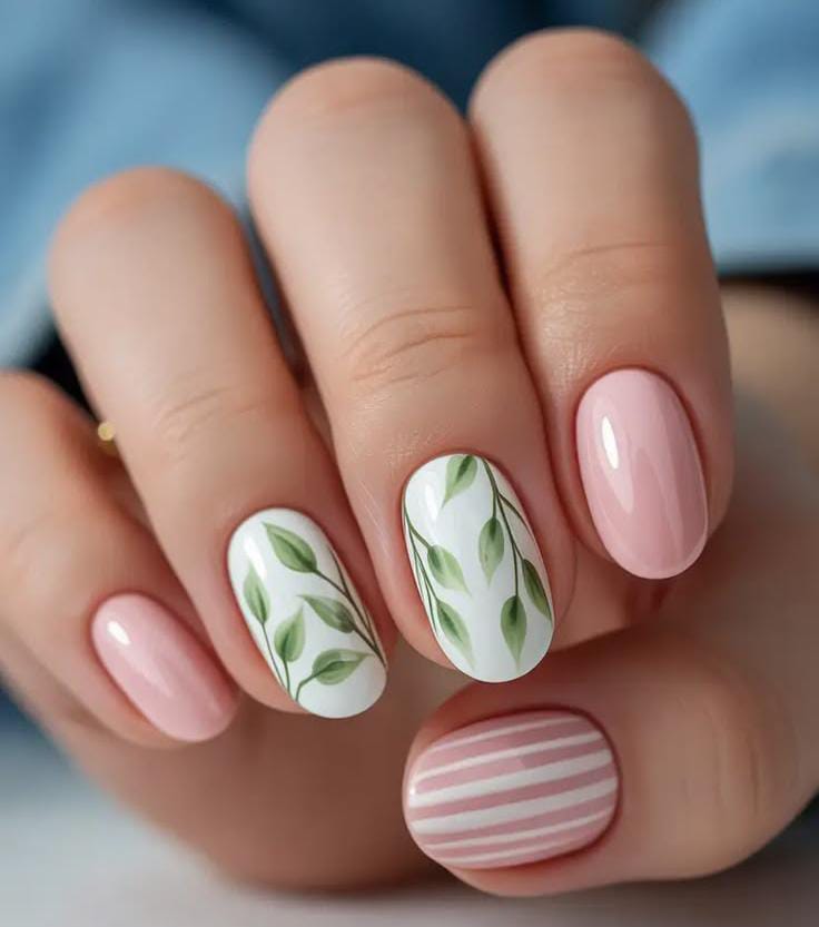These nails feature a glossy baby pink base paired with white accent nails decorated with delicate green leafy branches. A striped accent nail adds a subtle pattern that keeps the look fresh and modern May vibe.