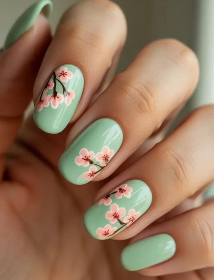 These nails feature a soft mint green base decorated with delicate pink cherry blossom-style flowers and thin branch details. The design feels fresh, light, and perfect for a soft spring or May-inspired look.