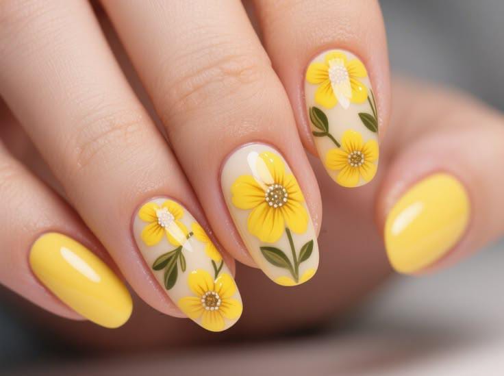 This design combines bright yellow nails with floral accent nails featuring cheerful yellow flowers and green leaves on a soft nude base. The overall vibe is warm, sunny, and playful, capturing the bright energy of May.