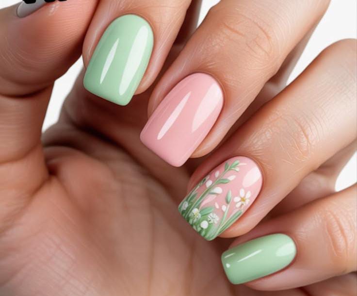 This design mixes soft pastel mint green and pink nails with a delicate floral accent featuring tiny white flowers and leafy details. The look feels fresh, gentle, and perfect for a light springtime or May vibe.