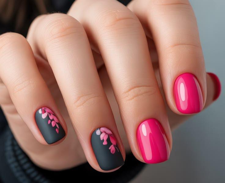 This design combines bright glossy pink nails with bold matte black accent nails for a striking contrast. Soft pink floral details on the black base give the look a cute yet stylish spring vibe perfect for May.