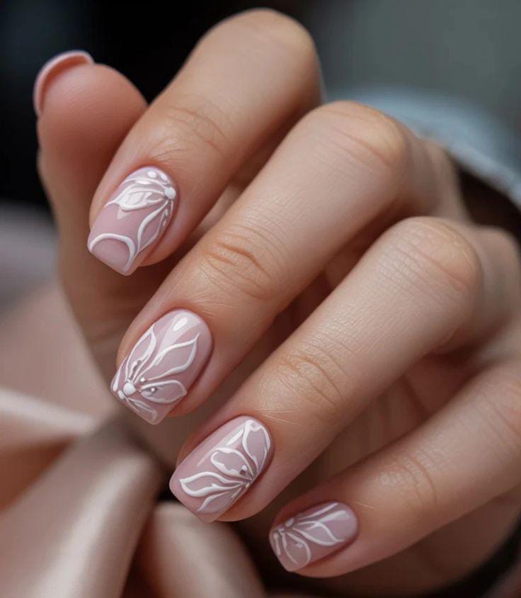 Blush White Floral Nails