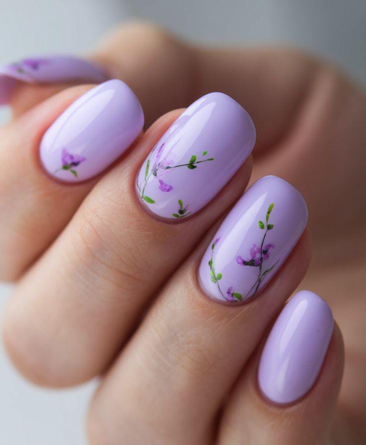 Soft lavender nails create a calm, glossy base while delicate purple flowers and tiny green stems add a light botanical touch. The design feels fresh, minimal, and perfect for a soft spring vibe and May manicure.