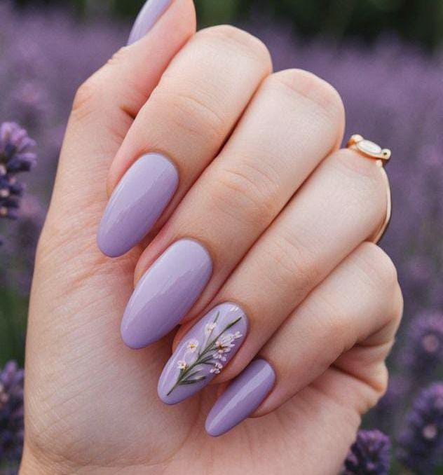 These almond-shaped lavender nails keep things simple with a smooth glossy finish and one floral accent nail. The tiny floral design adds a sweet, elegant touch that feels perfect for May. 🌸