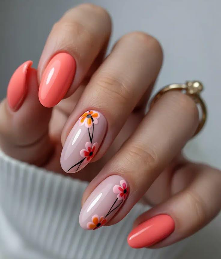 Bright coral nails pair with soft nude accent nails decorated with simple floral art and thin stems. The design feels fresh, cheerful, and perfect for a warm spring or early may summer look.