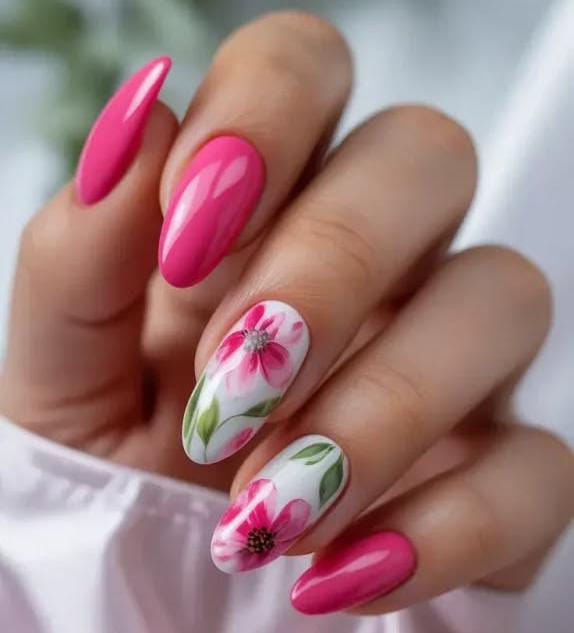 Bright pink nails create a bold, glossy base while a couple of accent nails feature soft white backgrounds with hand-painted pink flowers and green leaves. The design feels vibrant, fresh, and full of spring energy perfect for May.