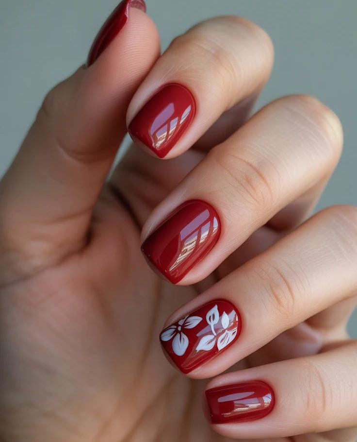 Deep glossy red nails give a timeless, elegant look, paired with a subtle white floral accent on one nail. The style feels simple, chic, and perfect for a classy spring perfect for May manicure. 🌸
