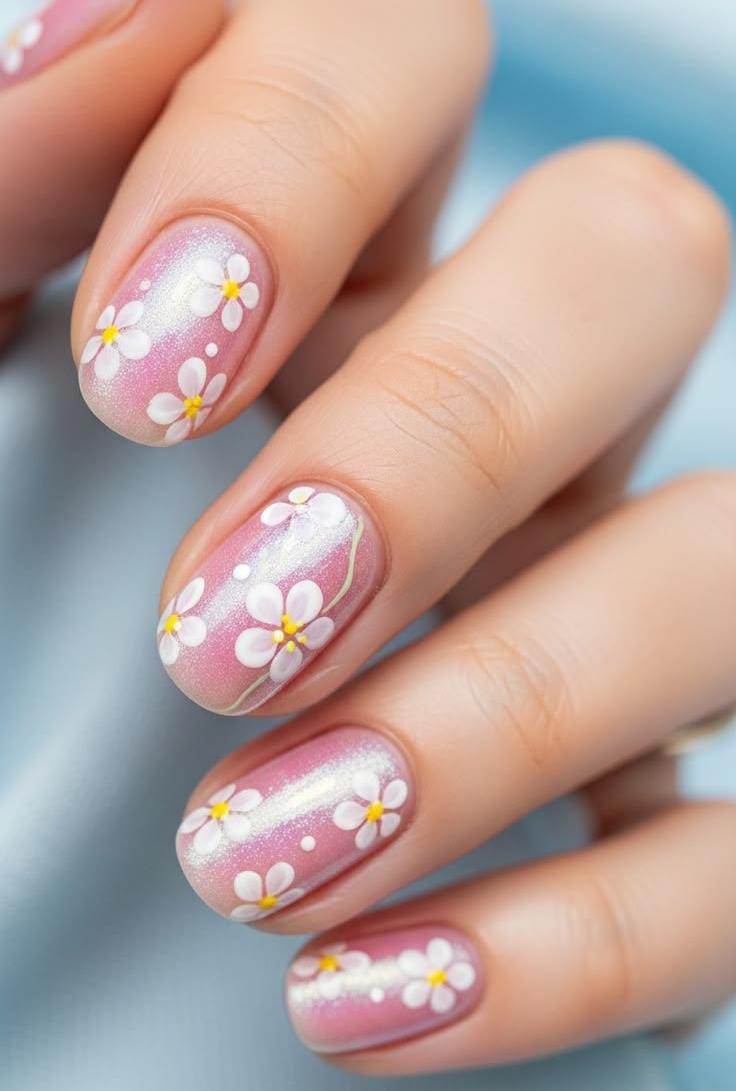 A soft pink shimmer base gives these nails a delicate, glowing look that feels perfect for spring. Small white daisy flowers add a sweet, fresh vibe that makes the design look light and playful May energy.