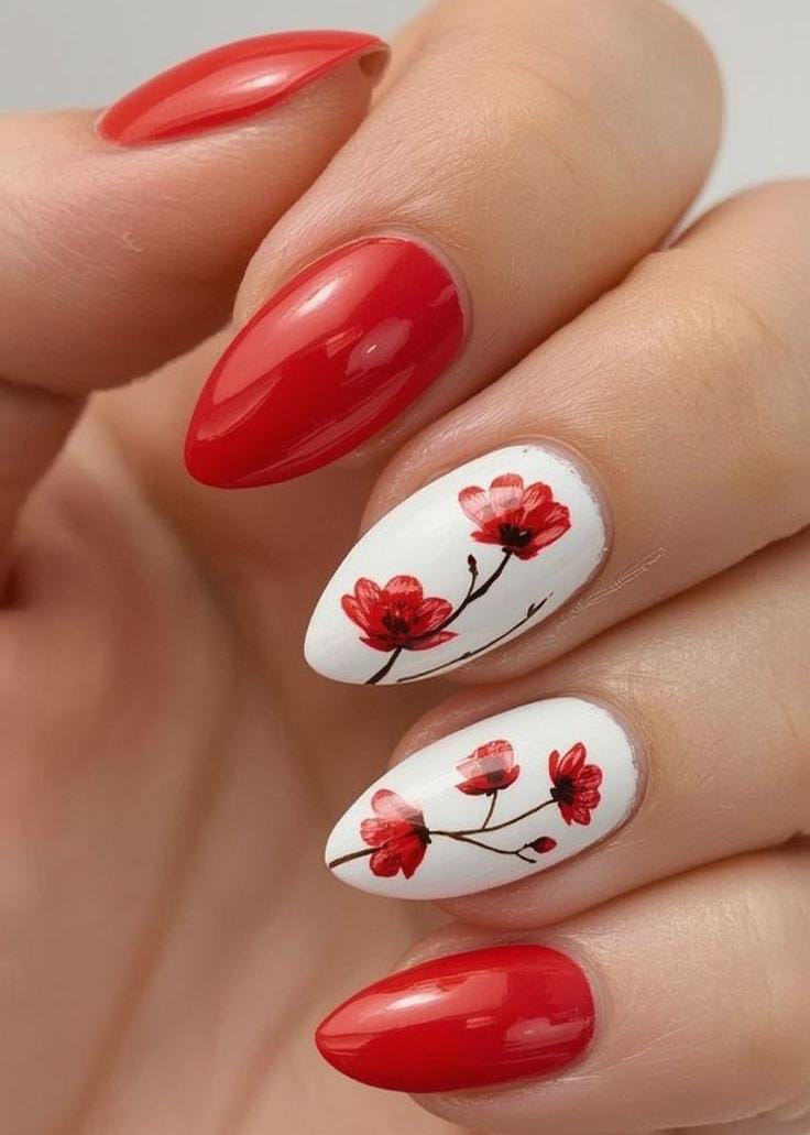 This design combines glossy red nails with white accent nails featuring delicate red floral art. The contrast creates a bold yet elegant look that feels romantic and eye-catching for May. 🌸