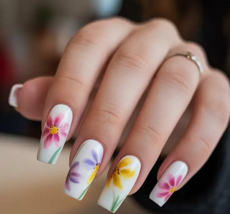 These nails feature a soft white base decorated with bright pink, purple, and yellow floral designs. The colorful flowers create a cheerful spring garden vibe that feels fresh and playful for May.