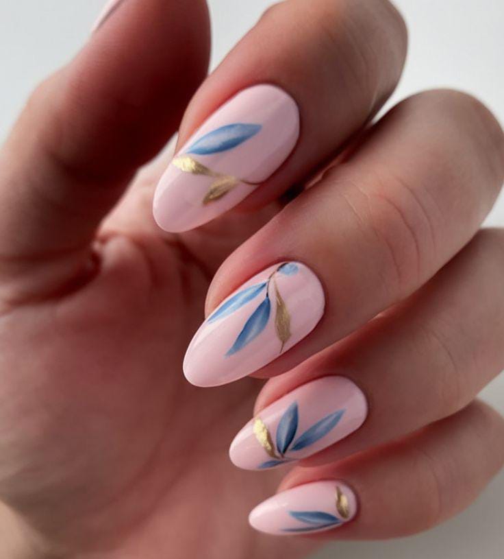 These nails feature a soft blush pink base with delicate blue and gold leaf design accents. The combination feels elegant, light, and perfect for a fresh spring-inspired May manicure. 🌿