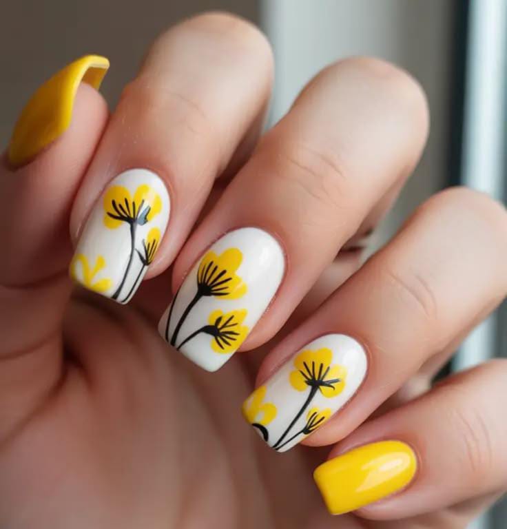 This design mixes solid glossy yellow nails with white accent nails featuring simple yellow floral art. The bright colors and clean look give the nails a sunny, happy spring feel and best May nail design.
