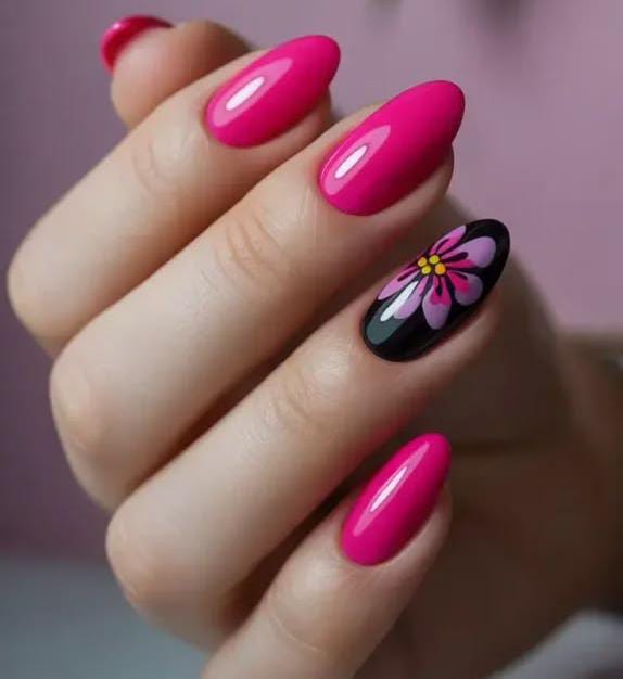 This design showcases bold glossy pink nails paired with a black accent nail featuring a large pink flower. The vibrant colors and playful floral detail create a fun and eye-catching spring look or May manicure.