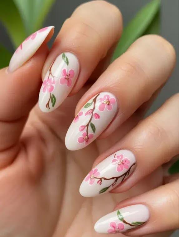 Soft white almond-shaped nails are decorated with delicate pink cherry blossom branches and tiny green leaves. The design feels light, fresh, and perfect for a soft spring vibe perfect for May.