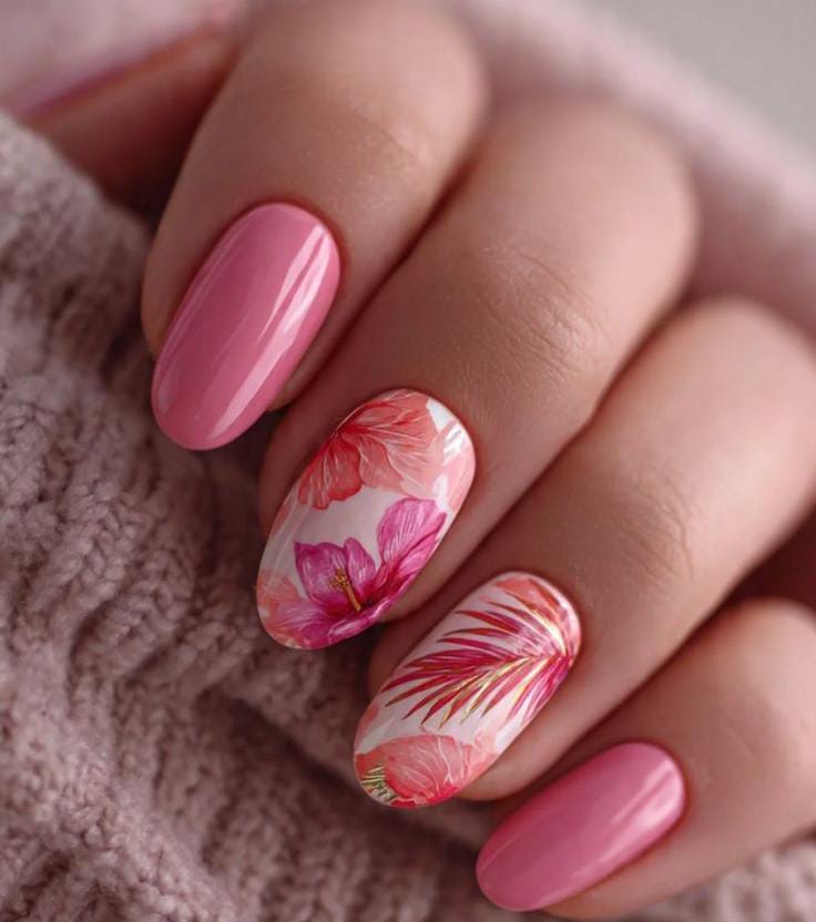 Glossy pink nails are paired with accent nails featuring bold tropical flowers and leafy patterns in warm pink and coral tones. The look feels vibrant, feminine, and perfect for a bright May manicure.