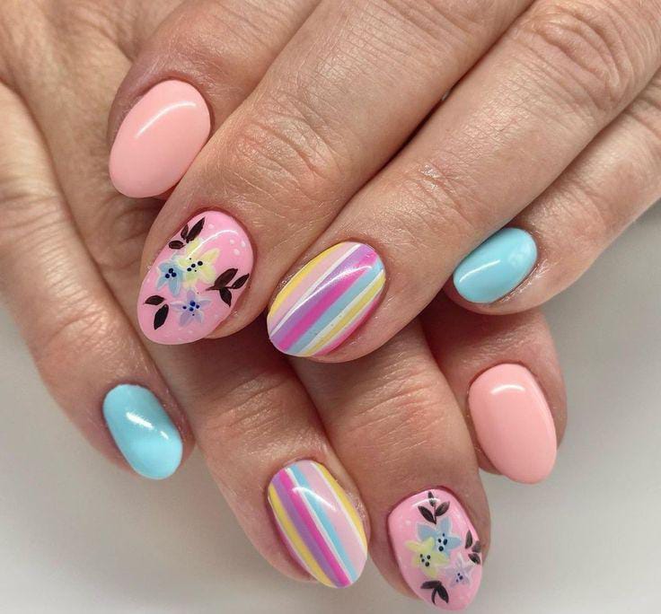 Soft pastel nails combine light pink, baby blue, and striped rainbow accents with tiny floral details. The overall look is playful, colorful, and perfect for a cheerful May manicure.