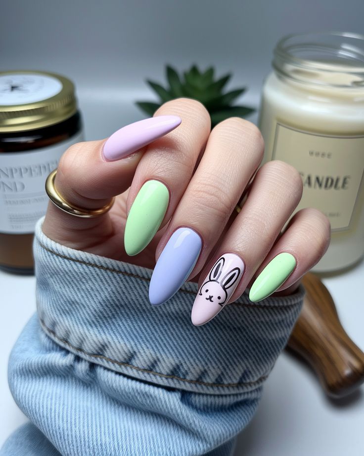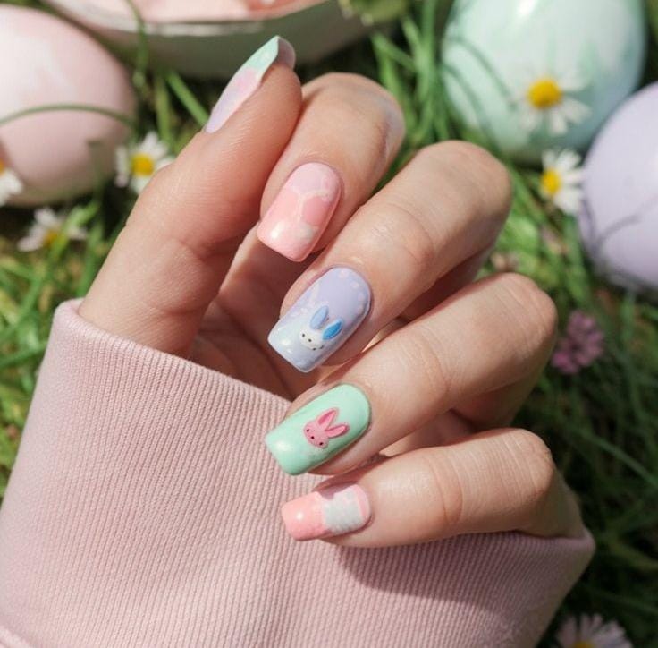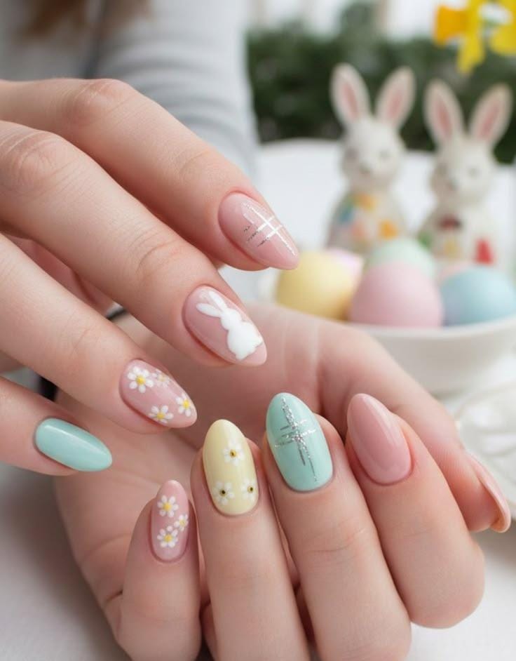 A cute Easter-inspired manicure with soft pastel shades like mint, yellow, and blush pink. Daisy accents and a tiny bunny silhouette give it a charming, festive springtime look.