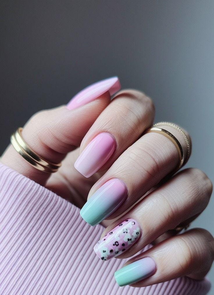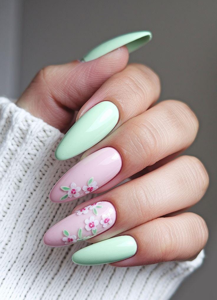 Soft mint green and blush pink nails create a delicate pastel combination with a clean, glossy finish. Tiny floral details add a light spring garden touch that feels fresh and elegant.