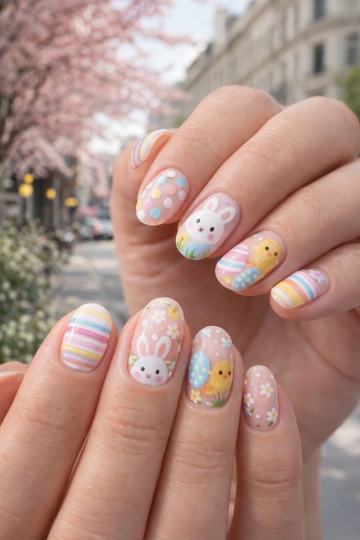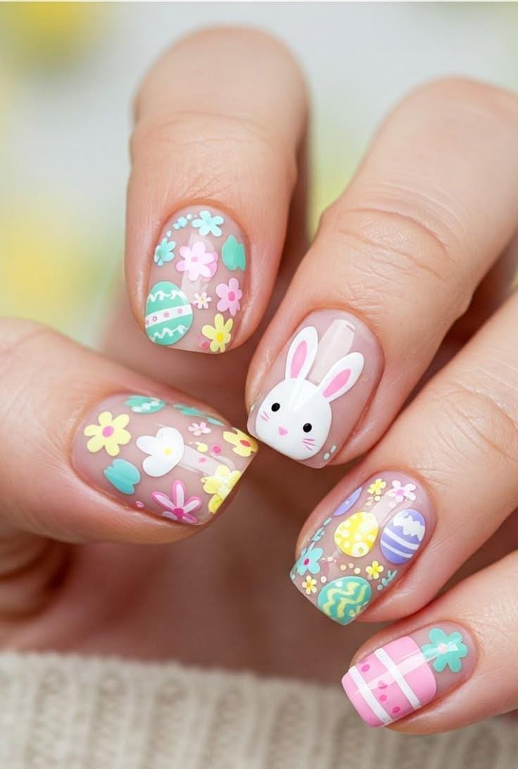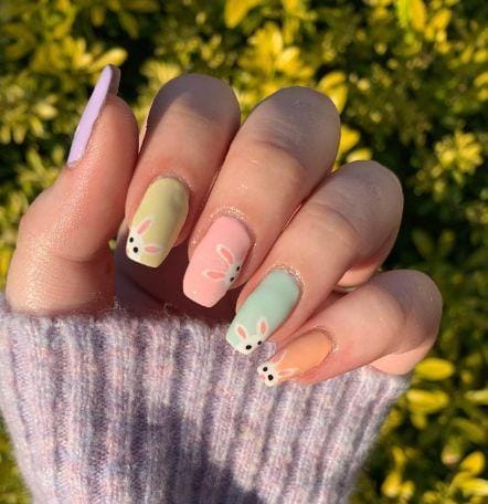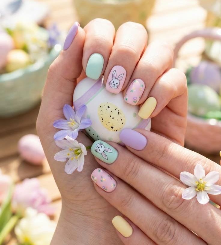 This playful manicure mixes soft pastel shades like mint, lavender, pink, and yellow across short rounded nails. Cute bunny illustrations and speckled egg-inspired details create a fun, festive Easter look.