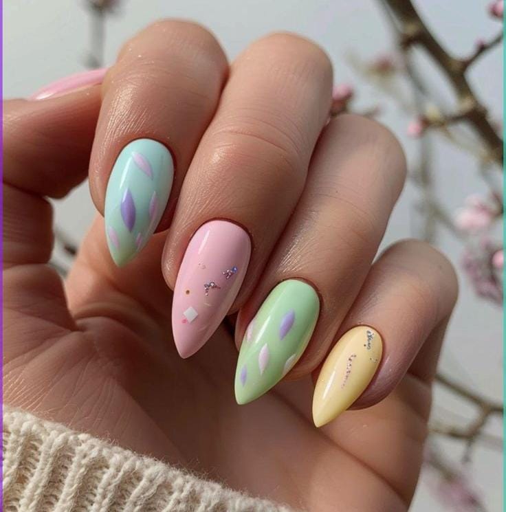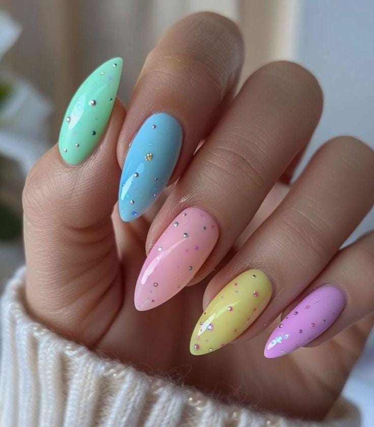 Almond-shaped nails are painted in soft pastel shades like mint green, baby pink, and buttery yellow. Speckled patterns and tiny rhinestone accents mimic decorated Easter eggs, creating a delicate and festive design.