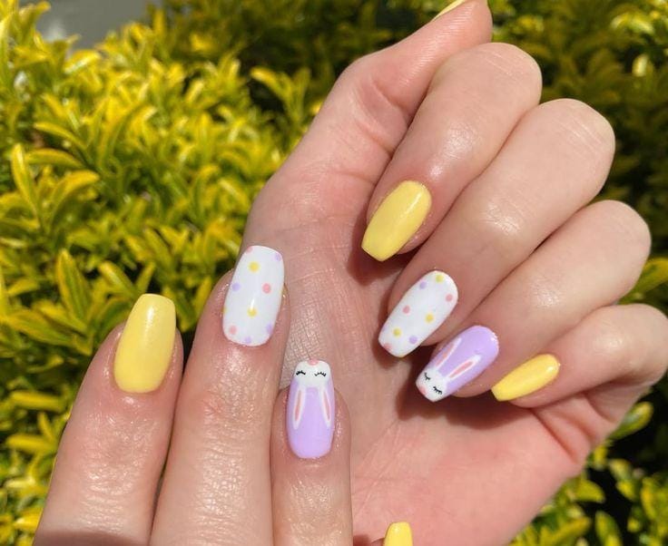 This cheerful manicure mixes soft yellow and lavender nails with white polka-dot accents in pastel colors. Cute bunny designs add a playful Easter touch, giving the look a bright and fun spring vibe.
