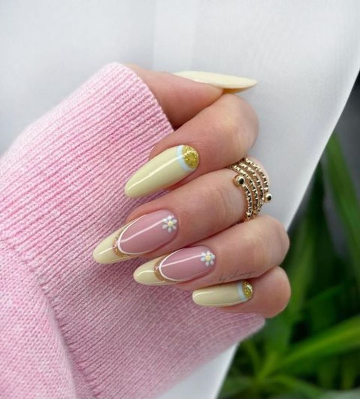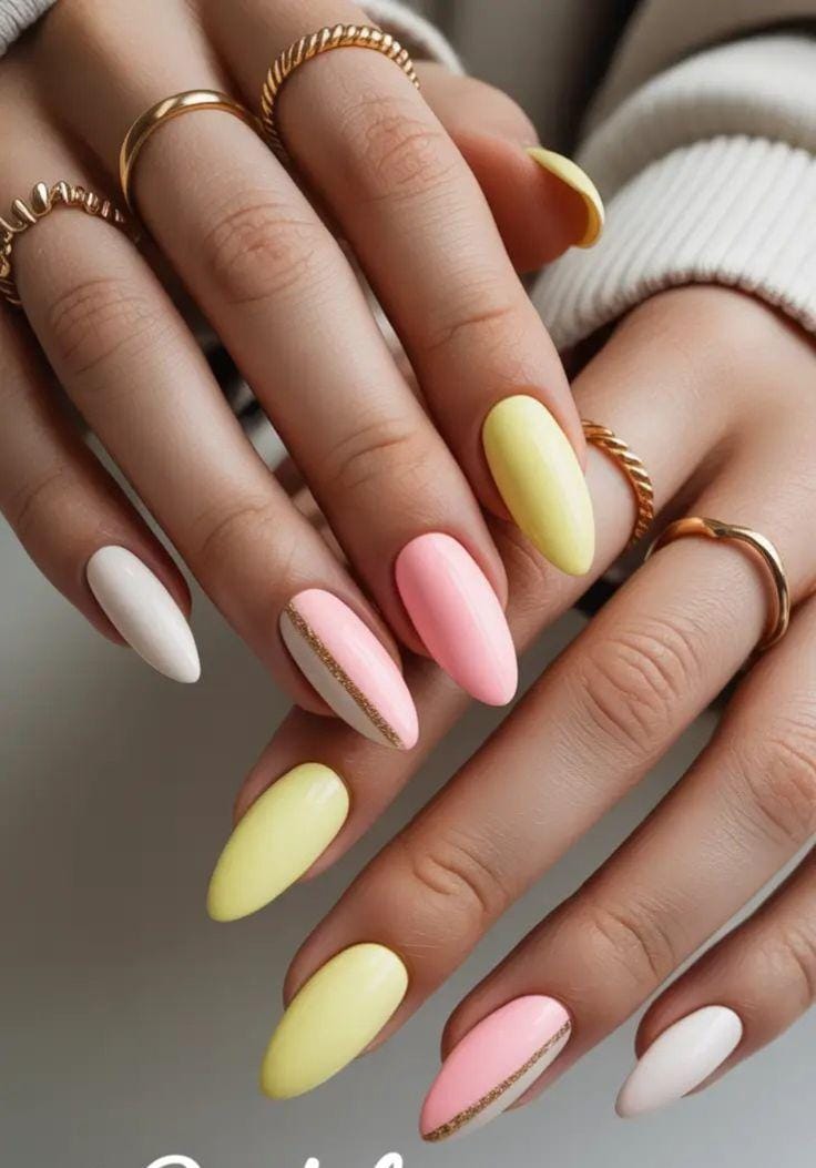 This design features soft pastel shades like baby yellow, blush pink, and creamy white on almond-shaped nails. Thin gold glitter lines add a simple, elegant accent that gives the look a polished spring vibe.