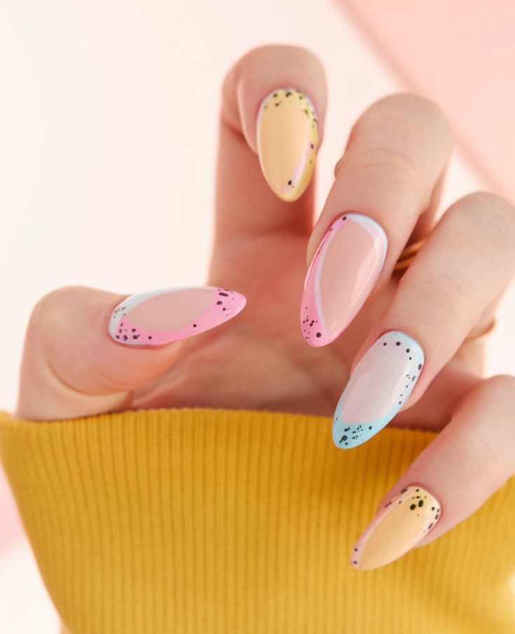 These pastel nails feature soft shades like mint, lavender, peach, and yellow topped with playful speckled dots that mimic Easter eggs. The design feels fun and seasonal, perfectly capturing the colorful charm of decorated eggs.