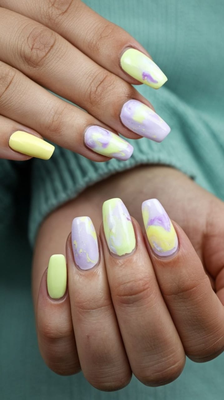 Soft pastel yellow and lavender shades swirl together in a dreamy marble pattern across the nails. The look feels light, playful, and perfect for a fresh spring or Easter vibe.