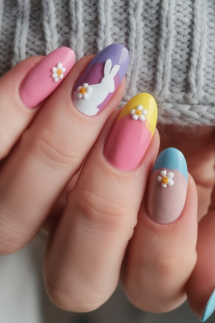 Soft pastel shades of pink, lavender, yellow, and blue create a sweet color-blocked design with tiny daisy accents. One accent nail features a cute white bunny silhouette, giving the manicure a playful Easter-themed vibe.