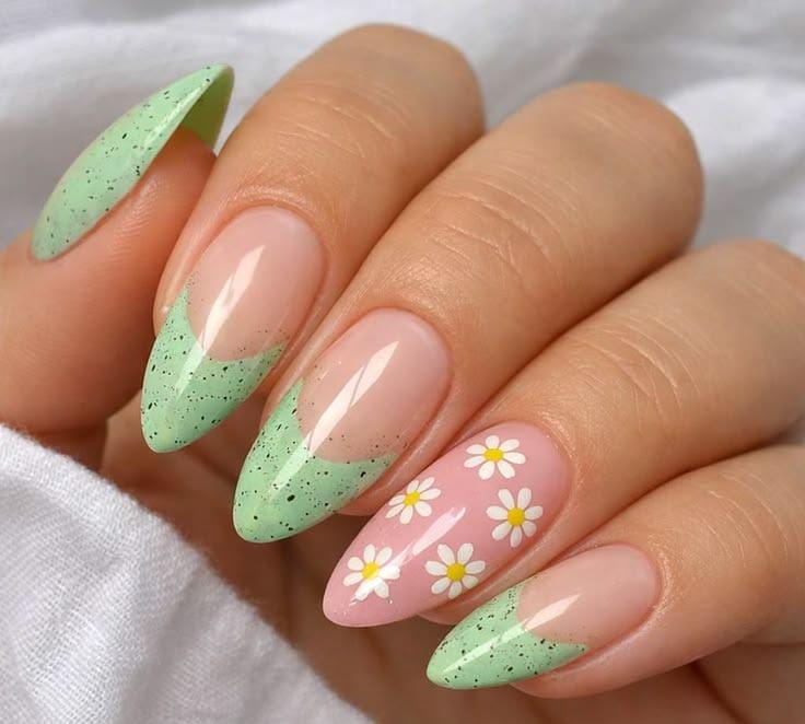 A modern pastel French tip uses soft mint green with a speckled effect for a fresh spring look. One accent nail with small white daisies adds a cute, cheerful Easter-inspired touch.