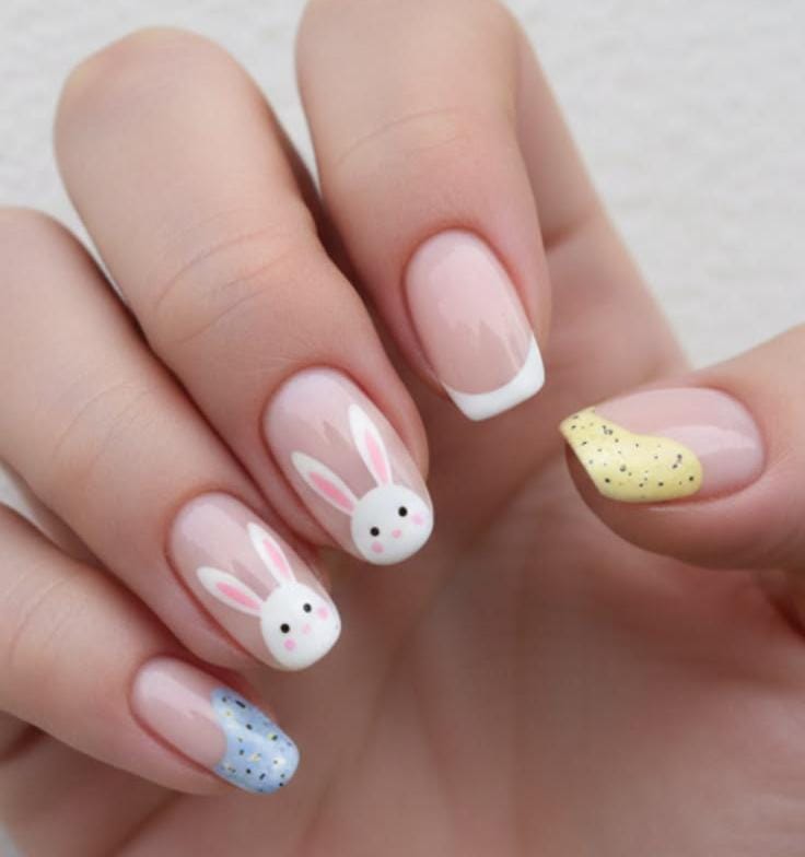 This soft pastel manicure combines classic nude and white French tips with playful bunny face accents. Small pastel speckled details in yellow and blue add a cute Easter egg–inspired touch.