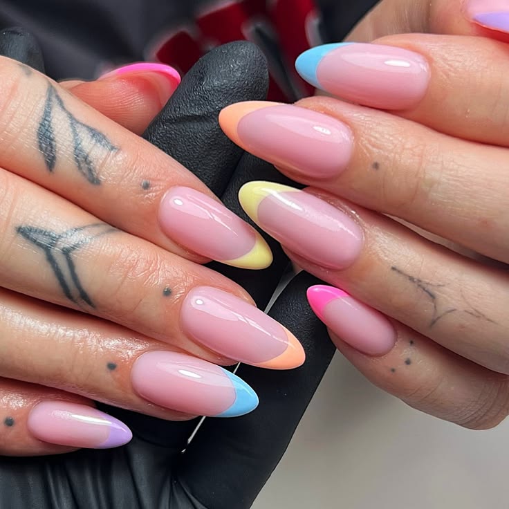 Soft pink nails are styled with almond shapes and finished with delicate pastel French tips in shades like blue, yellow, peach, and pink. The design feels light, playful, and perfect for spring with its subtle rainbow look.