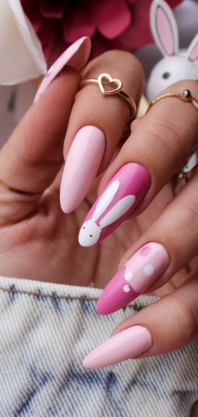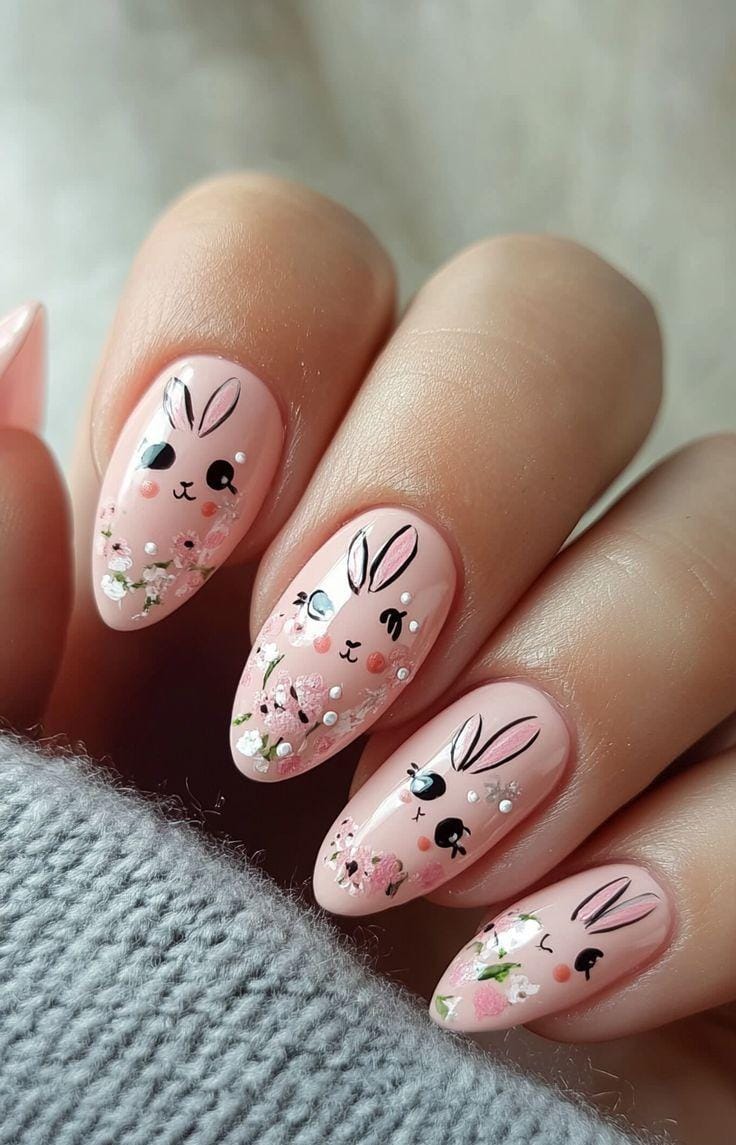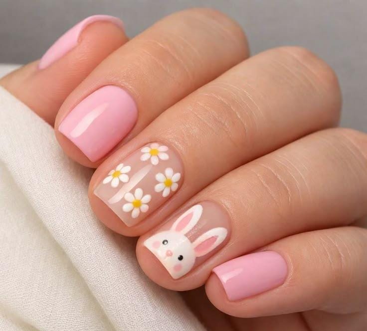 A soft pink base is decorated with cute bunny faces and delicate floral details for a sweet Easter-inspired look. Tiny rhinestones and soft pastel accents make the design feel playful, charming, and full of springtime personality.