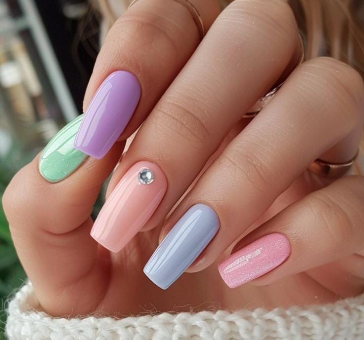 A playful mix of soft pastel shades like lavender, mint, baby blue, and pink gives this manicure a sweet Easter candy vibe. The glossy finish and simple accent gem keep the design cute, fresh, and perfect for spring.