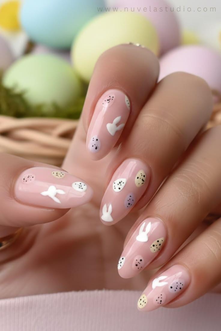 This soft pink manicure features tiny pastel egg patterns and adorable white bunny silhouettes scattered across the nails. The design feels festive and whimsical, capturing the fun and charm of Easter.