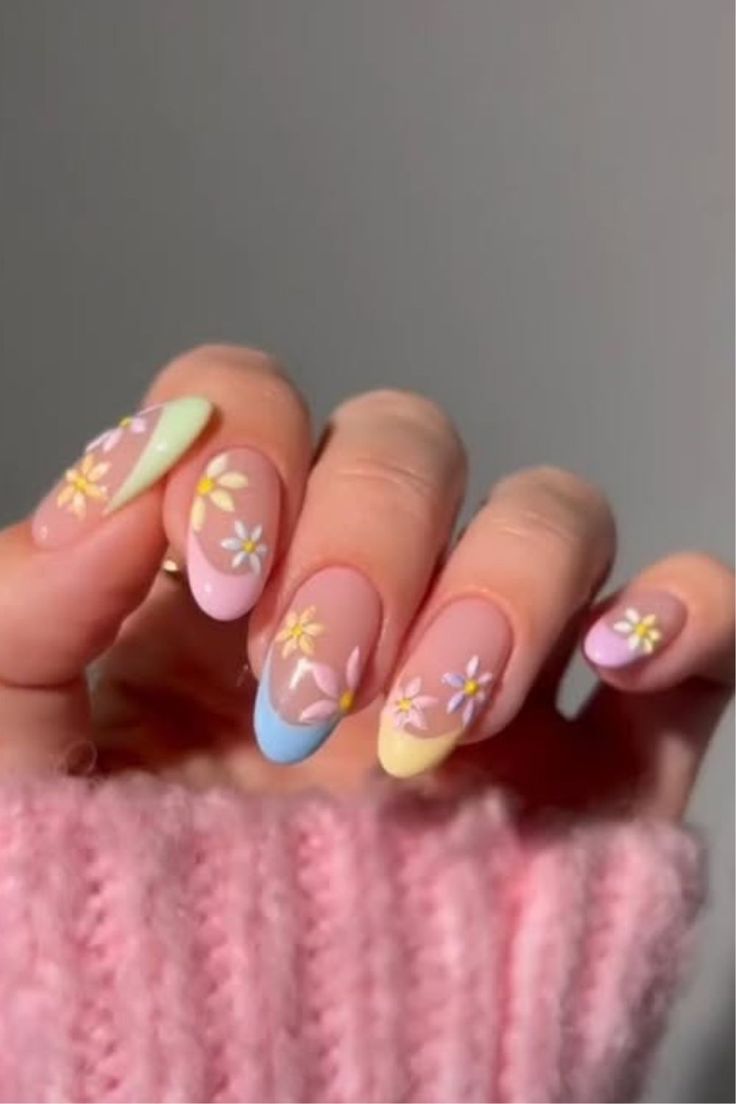 A mix of soft pastel shades like pink, yellow, blue, and lavender is paired with tiny white daisy accents on a few nails. The floral details give the manicure a fresh springtime vibe that feels cheerful and delicate.